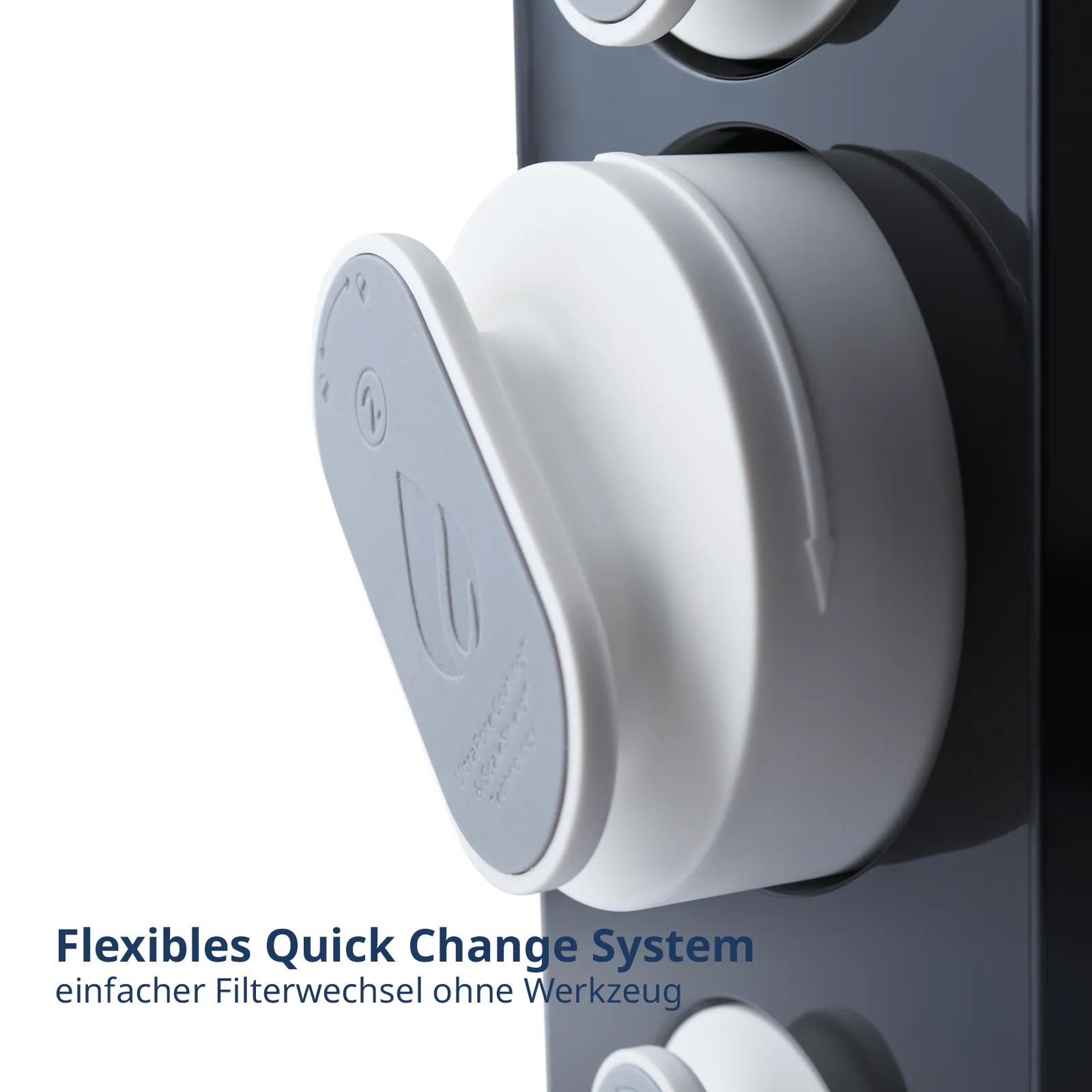 - Automatische Filterwechselanzeige: Zeigt den Filterwechsel je nach Nutzungsverhalten an.
