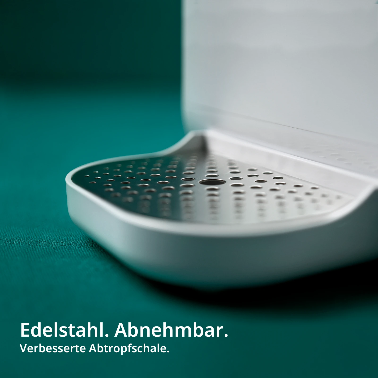 Die Quella Pro überzeugt mit einem höheren Auslass, unter den auch große Karaffen passen. Die verbesserte Abtropfschale ist magnetisch und kann einfach abgenommen werden. Für noch höhere Gefäße. (Bis zu 28% höher als bei der Quella Life)