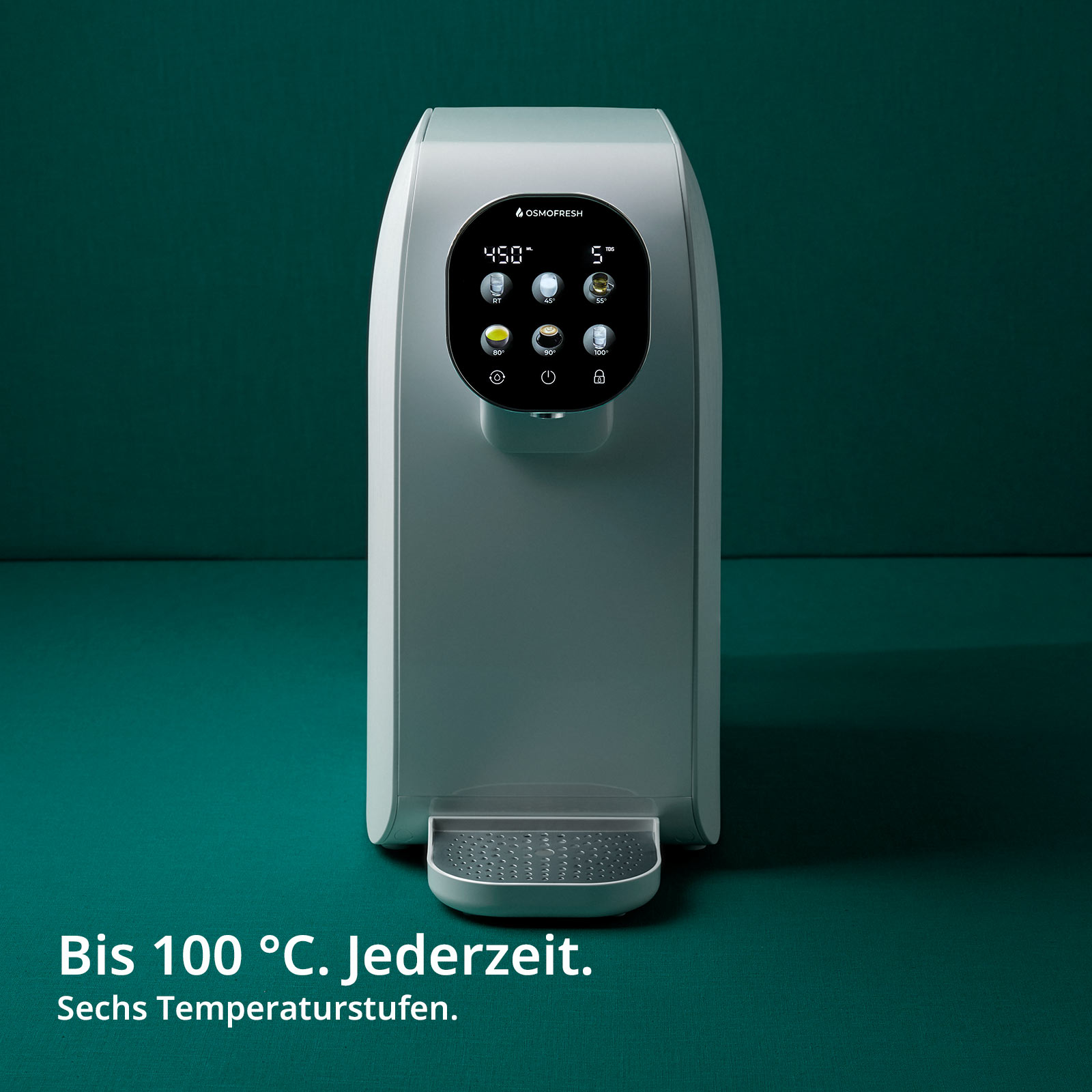 Die Quella Pro ist mit einem integriertem Durchlauferhitzer ausgestattet, der das Wasser in nur 3 Sekunden zum kochen bringt. Über das Touch-Display können Sie bequem aus 6 verschiedenen Temperaturstufen wählen: 15° - 22°C (RT), 45°C, 55°C, 80°C, 90°C, 100°C .