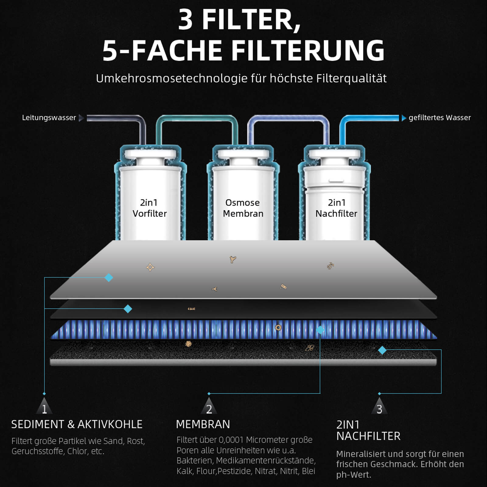 Die ultra-feinen Poren der Osmose Membran halten auch die kleinsten Stoffe im Wasser zurück. Unter anderem Bakterien, Viren Medikamentenrückstände, Kalk, Flour, Pestizide, Nitrat, Nitrit, Blei, Uran,....